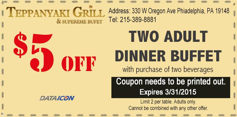 Teppanyaki Grill & Supreme Buffet Restaurant, Richmond, VA 23294 ... Teppanyaki Grill & Supreme Buffet Restaurant, Richmond, VA 23294, Online Order, Take Out, Take Out, Online Coupon, Print Coupon Reach© Dinner or Lunch Buffet $1 Off (Dine In Only) Valid for up to 2 peple per check. Not valid with any other offers or on holidays with Reach@© coupon only. Photocopies not accepted