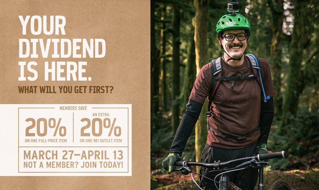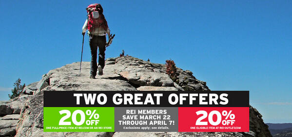 50 Great Ways to Use Your REI 20% Off Coupon & Member Reward - CleverHiker To sweeten the deal, from 3/18 to 3/28 REI Members save 20% on one full-price item and an extra 20% off one REI Outlet item with coupon code MEMBER20. Now is one of the best times of the year to save on a big-ticket purchase such as a tent, sleeping bag, backpack, sleeping pad, or anything else with a hefty price tag.